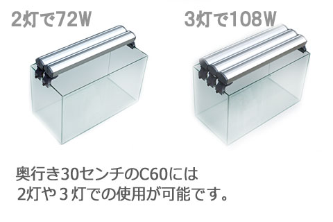 - 奥行き66ミリのスリムボディだから、例えば60センチレギュラー水槽に3本載せることが可能です。36Wx3=108Wにもなります。