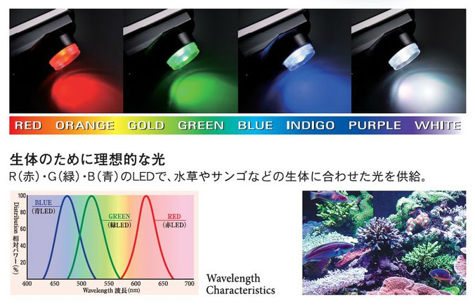 ・R(赤)・G(緑)・B(青)のLEDで、水草やサンゴなどの生体に合わせた光を供給。