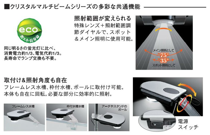※クリスタルマルチビームは「コンパクト水槽用の照明器具として、幅60cm水槽からのスポット照明として」の使用になります。