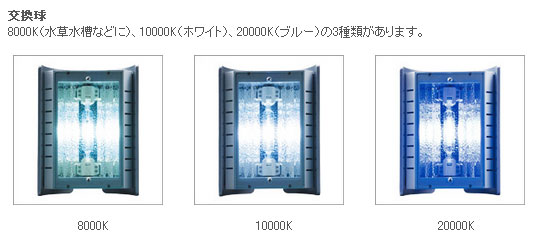 交換球「8000K(水草水槽などに)」「10000K(ホワイト球)」「20000K(ブルー球)」カラーバリエーション有り。