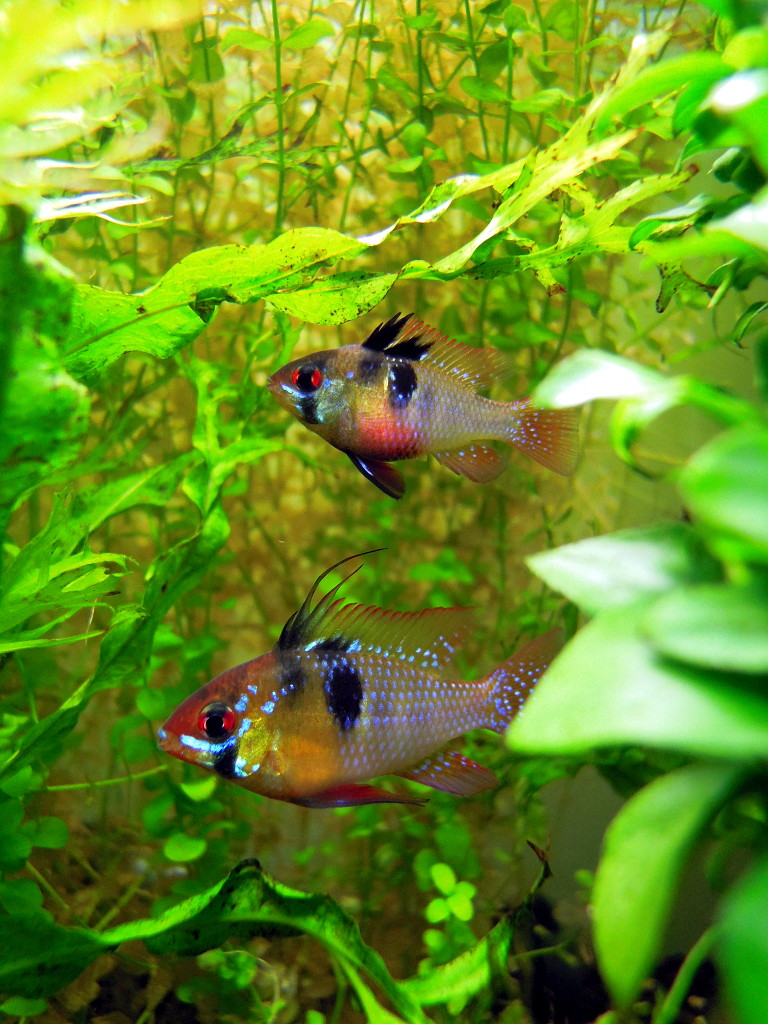 | 繁殖難易度 | 普通。オープンスポウナーの基質産卵で知られ、平たい石や底床などにばら蒔くように卵を産む。28℃とやや高温で薄暗い環境にすると産みやすいようだ。一度に100〜200程度の黄色い卵を産む。産卵後はオスとメスが交互に卵を守る。稚魚は小さく初期飼料はインフゾリア?を与える必要がある。ブラインシュリンプでも可能だが孵化したてのものに限る。捕食者さえいなければ特に隔離する必要はない。ちょっかいを出すような魚と混泳すると卵や稚魚を食べてしまうので、確実に増やしたい場合は隔離する。 | |