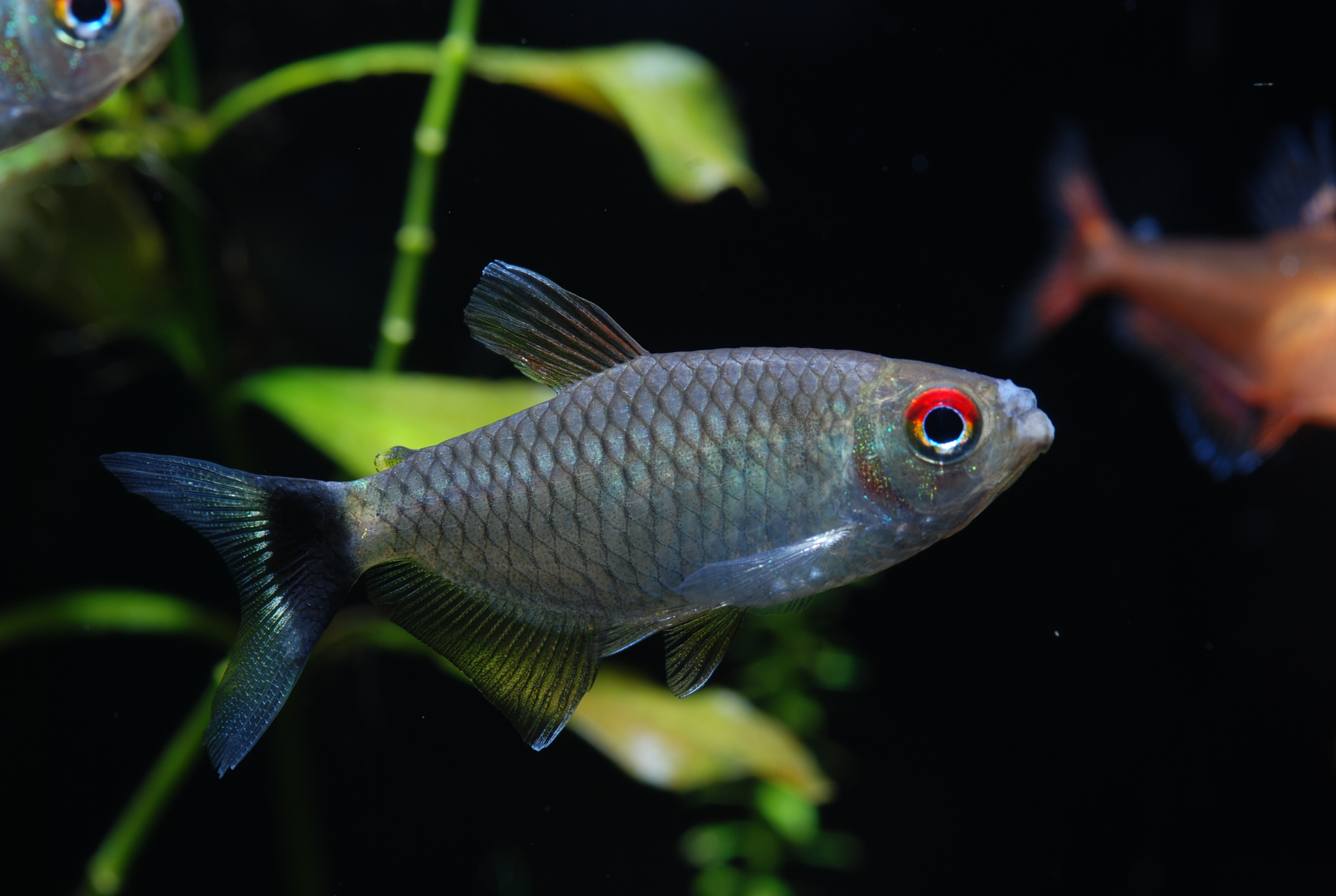 別名レッドアイ・テトラという名前から分かる通り、赤い目が特徴。尾の付け根と、背ビレ・尻ビレが黒くなる。