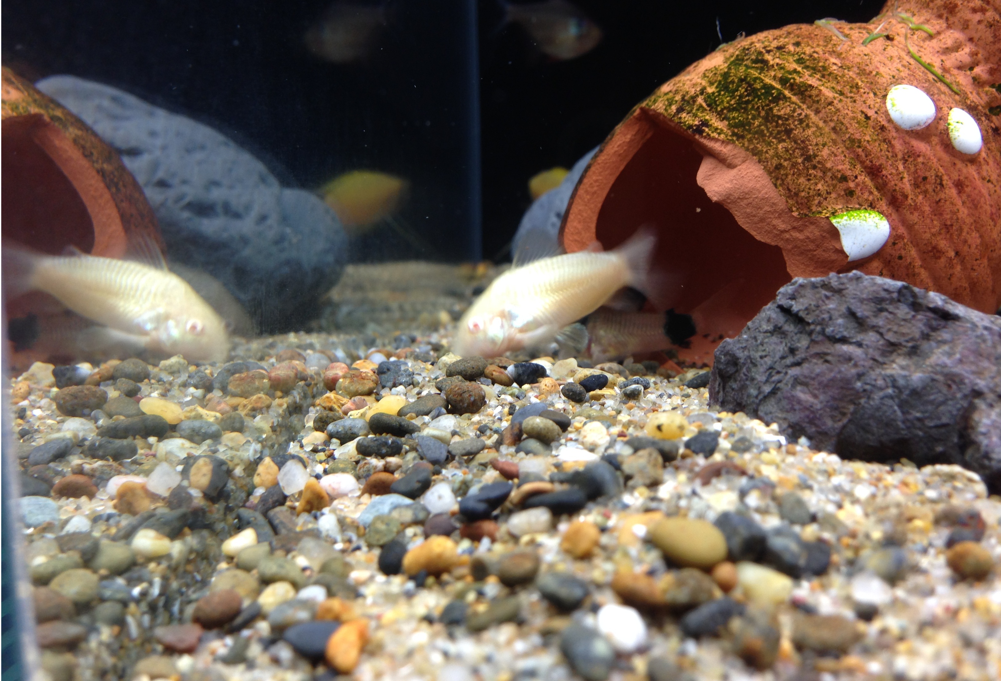 推奨されるアクセサリなど底床を口でさらうようにエサを探すので細かな砂状の底床が望ましい。臆病なので隠れ家となる土管?がお奨め。ほかにも隠れられる大きな流木水草など。また適度な水流を好むので、水流を生むような水中ポンプろ過器?
