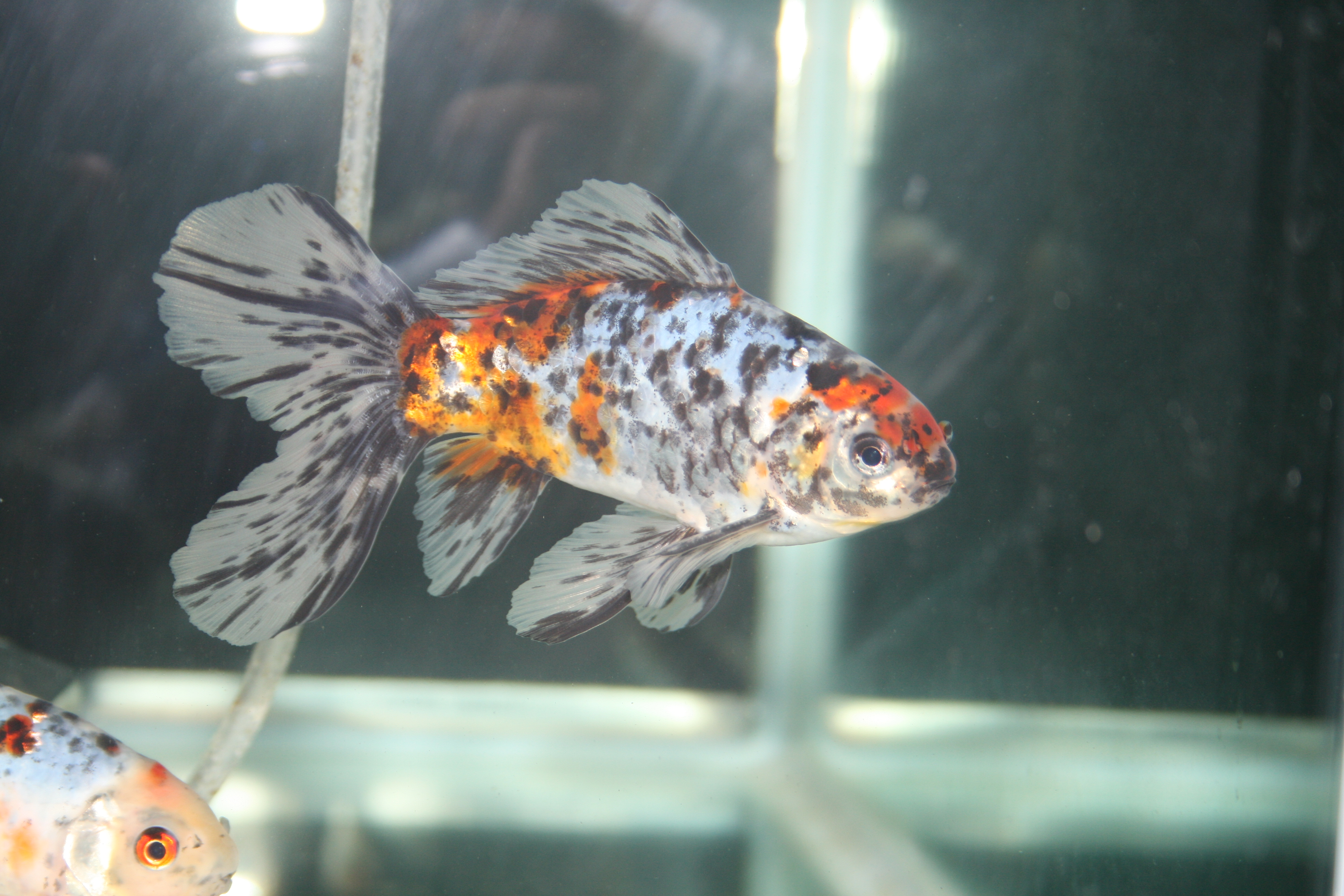 ブリストルシュブンキンはイギリスの愛好家がブリストル地方で朱文金をもとに作った種。横から見ると尾びれがハート型になる。体色は朱文金と同じくキャリコ模様。