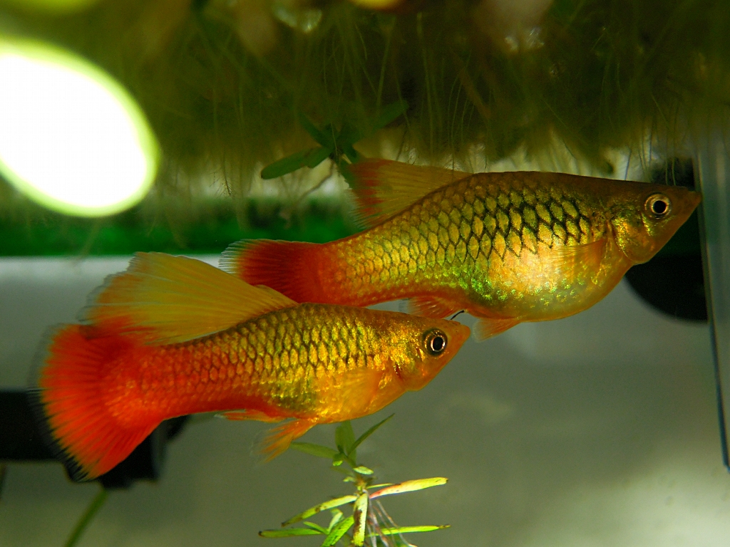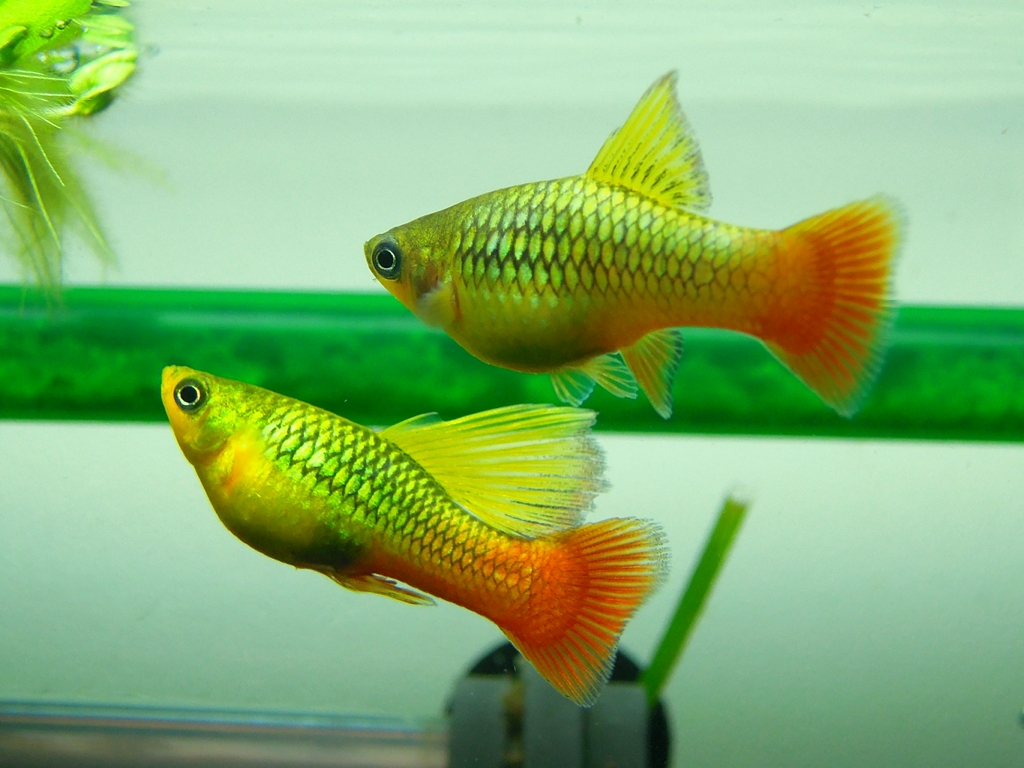 | 繁殖難易度 | 非常にやさしい。 繁殖も容易で特にすることはありません。母親のお腹の中で子どもが回遊できるまで大きくなるので気がついたら水槽が子どもで一杯、なんてこともよくあります。 稚魚の飼育は他の魚に捕食されないように水草を増やすか、大量に増やしたい場合は隔離してブラインシュリンプなどを与えると良いだろう。人工飼料を細かく砕いたものでも飼育可能だ。 | |