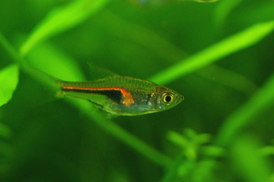 ラスボラ・エスペイに良く似た種で、幼魚のうちはレモンイエローになる。エスペイは成長すると全体的に赤みが差しますが、本種はバチ模様を中心に色が濃くなり、名前の通りグローライトのようなオレンジ色になる。