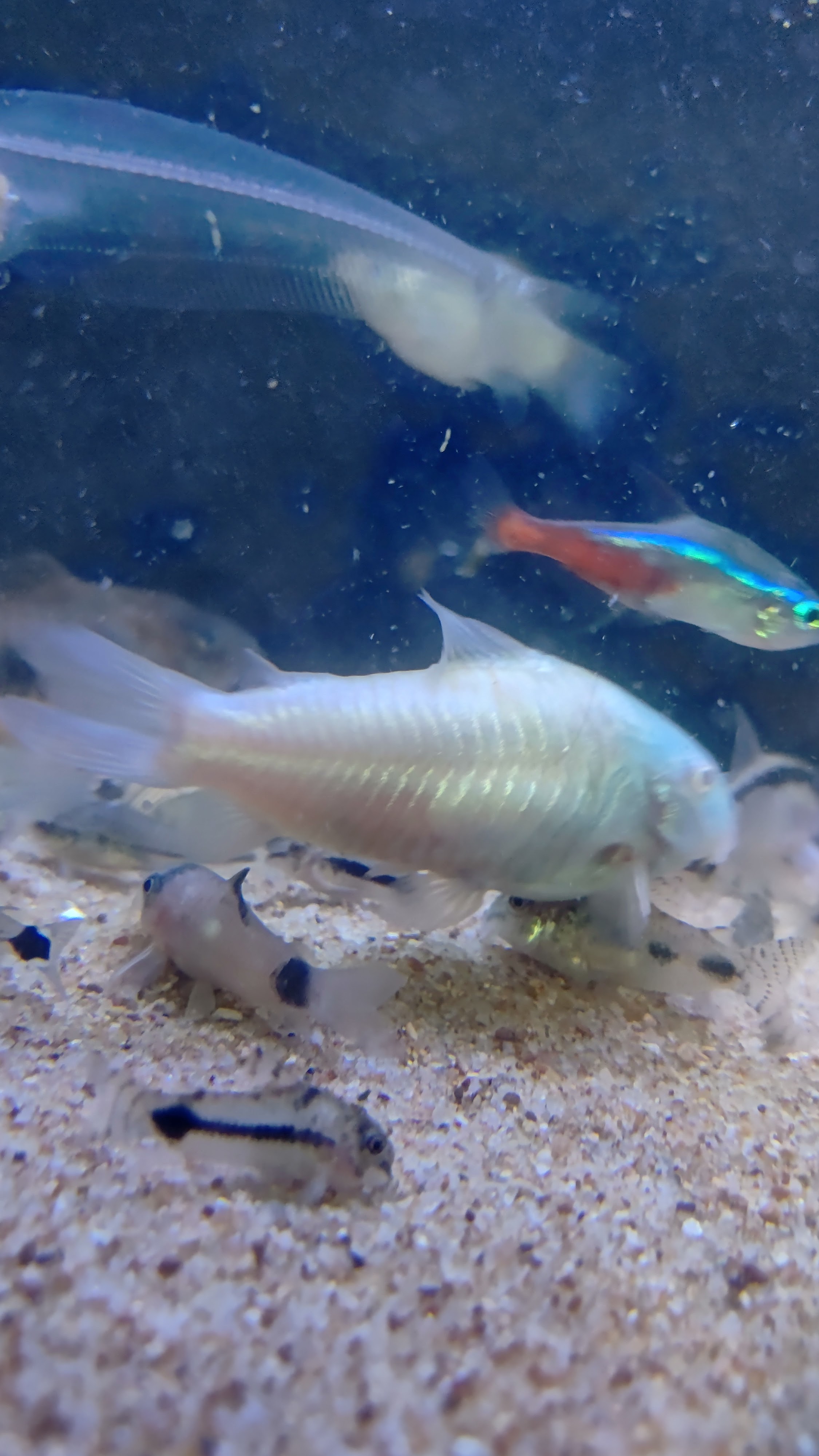 推奨されるアクセサリなど底床を口でさらうようにエサを探すので細かな砂状の底床が望ましい。臆病なので隠れ家となる土管?がお奨め。ほかにも隠れられる大きな流木水草など。また適度な水流を好むので、水流を生むような水中ポンプろ過器?