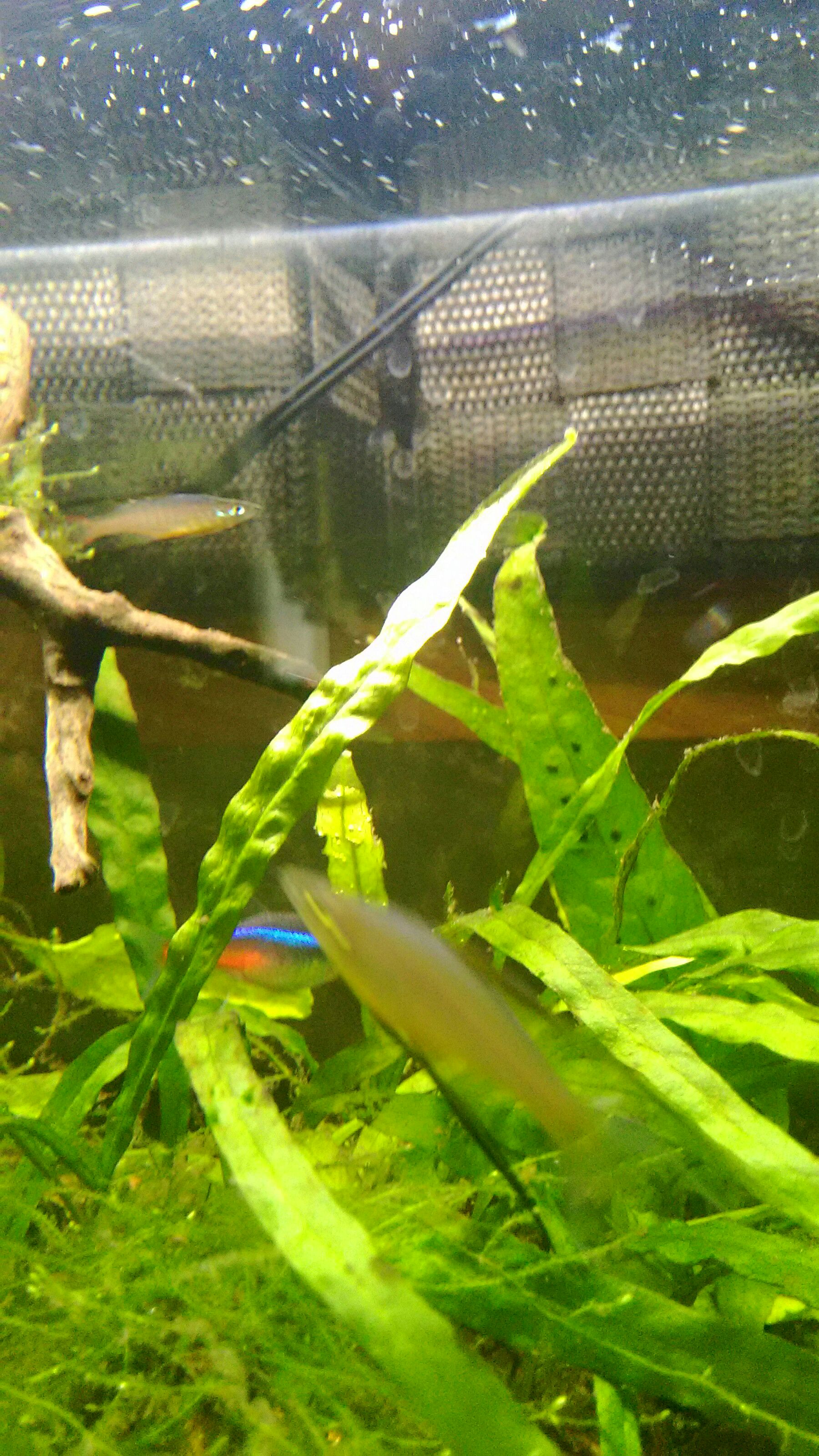 90×45×45水槽。個体25匹、混泳ネオンテトラ30匹、クーリーローチ10匹。半分は背面喫水線までの岩組と左半分が水草の水槽に混泳中、しきりにフィンダンスをしている、雌雄の判別は困難。見ているだけで楽しくなる。クーリーローチもお腹がすくと岩の隙間から顔を出して餌を探している。お互いに干渉しなくて安心できる。(名無しさん 2017-06-30 (金) 15:36:48